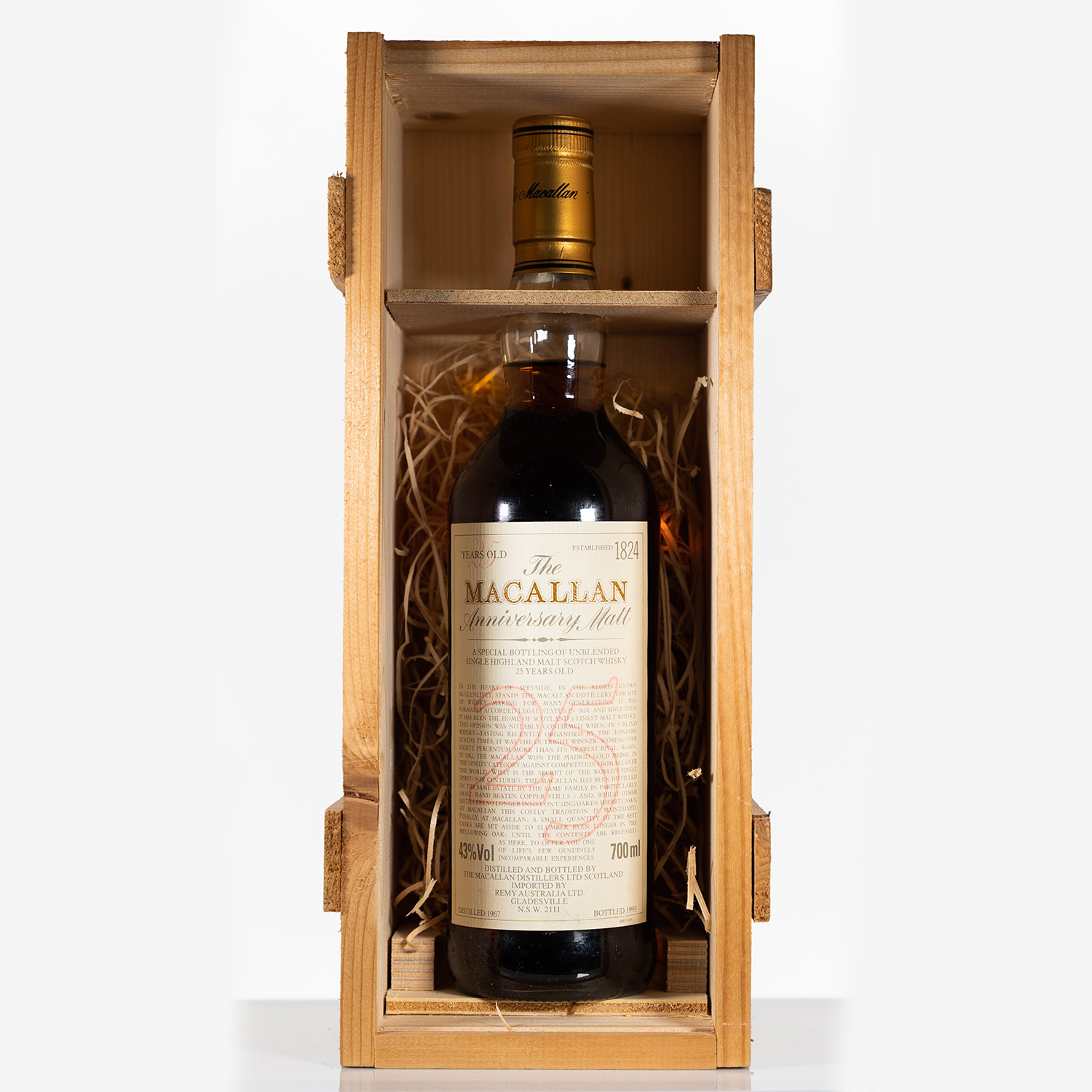 The Macallan 1967-1993 Anniversary Malt 25 Years Old represents a snapshot in time. It is both very rare and very collectible. This Macallan was bottled in 1993 after 25 years in Sherry casks and comes with a high neck fill (as per photograph) and is supplied with the original wooden box (it has never been removed from crate). Both bottle and box are in immaculate condition.